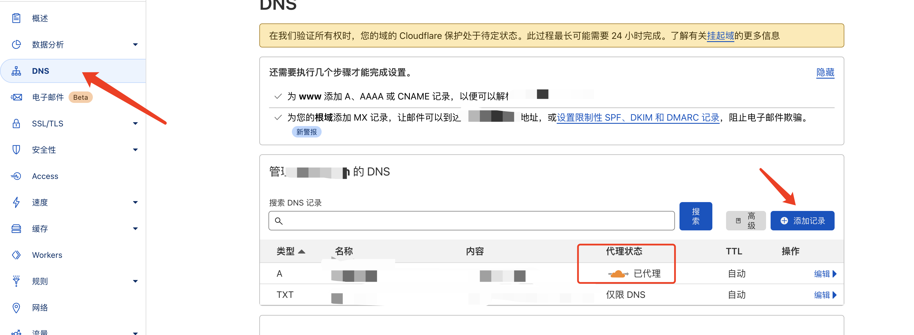 Cloudflare会自动检测,一般几分钟就成功了然后手动添加一条DNS记录如下图。记得开启这个已代理,图标为黄色即为开启